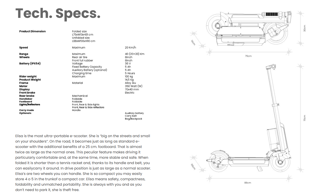 Το ηλεκτρικό Scooter Elisa εχει πολύ στιβαρη κατασκευή αλλά είναι και συμπαγές για να χωράει παντού και μεταφέρεται εύκολα. Με 350-Watt κινητήρα μπροστινής κίνησης και αυτονομία 20χλμ (περιλαμβανεται 1 Μπαταρία: 36V, 5Ah) έως 40 χλμ ME THN EXTRA ΜΠΑΤΑΡΙΑ που δεν περιλαμβανεται αλλα αγοραζεται εξτρα και μοναδική marine λύση για σκάφη αναψυχής.Διπλωμένο είναι μόλις 75x30cm !! Αυτό είναι όχι περισσότερο από μια ρακέτα του τένις.