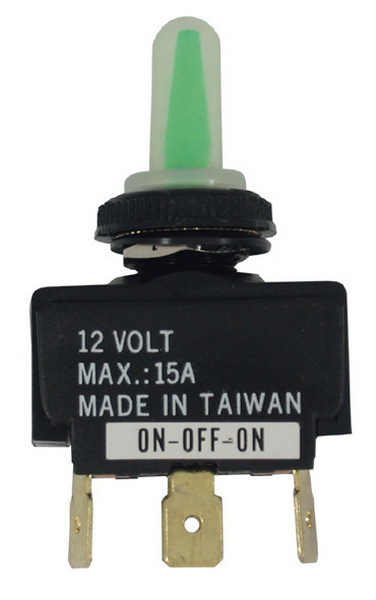 Διακόπτης με φωτιζόμενo λεβιε, πλήρης με διαφανές στεγανό καπάκι. Μέγιστη ένταση ρεύματος 16A στα 12V, 10A στα 24V. Διαστάσεις mm. 35 x 20,4 x Υ21 ώρες. Τρύπα Ø mm. 12.