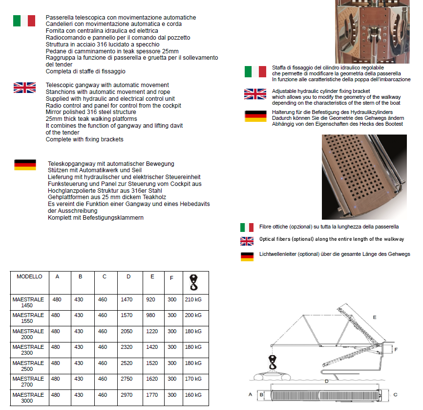 Πασαρέλα υδραυλική made in Italy πλήρης με μονάδα υδραυλικού ελέγχου, ηλεκτρική μονάδα ελέγχου με τηλεχειριστήριο και εξωτερικό πληκτρολόγιο χειριστήριο IP 66, αυτόματοι ορθοστάτες/κολωνάκια, διάδρομος σε χοντρό teak 25 χιλ. 2 χρόνια εγγύηση.
